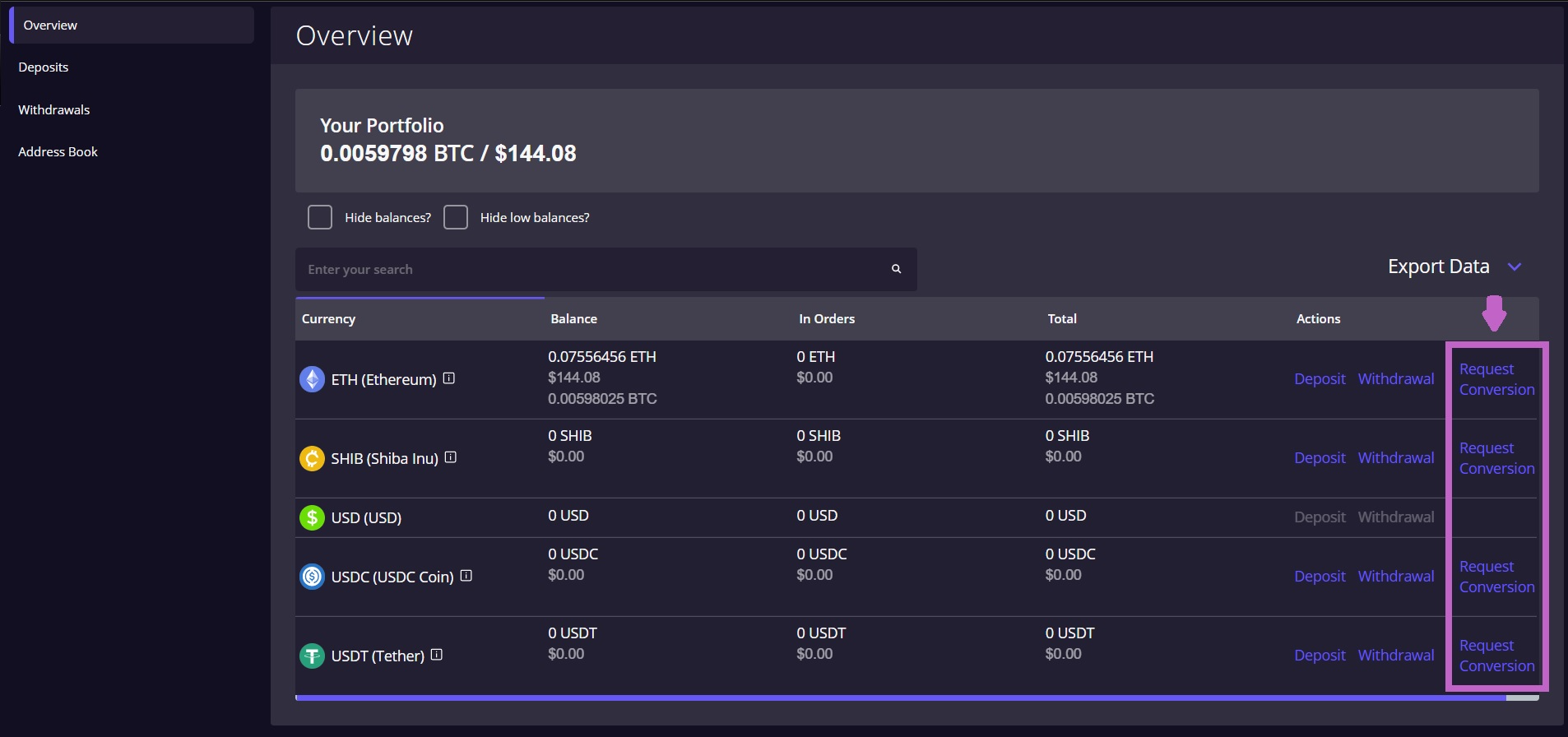 1) On the Overview/Portfolio page, find the digital asset you wish to convert and select 'Request Conversion' next to Withdrawal.