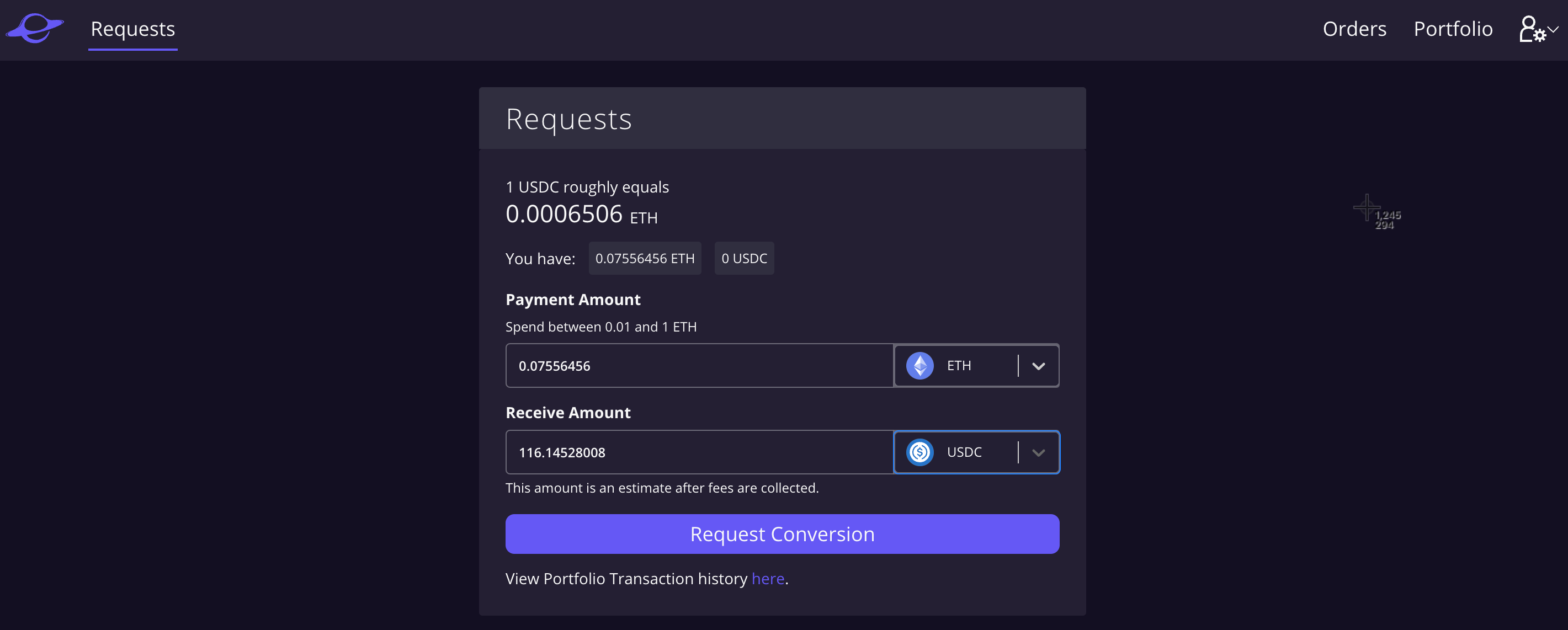 2) Select the asset you want to convert to, enter the amount you want to convert, and hit 'Request Conversion'.